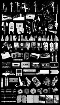 spray cans, markers, audio tapes, mics, speakers, barbed wire, buildings, telephone & power poles, paper textures, flowers, crates, caps, turntable, gas mask, bulletts, the moon, urban scenes & more.