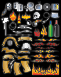 Spay Cans, Caps, Flames, 3D Graffiti, Tribals, Wings, scrolls & Banners, Hearts, Barbed Wire, Speakers, Crowns, Cityscapes, Music & Media Items & more.