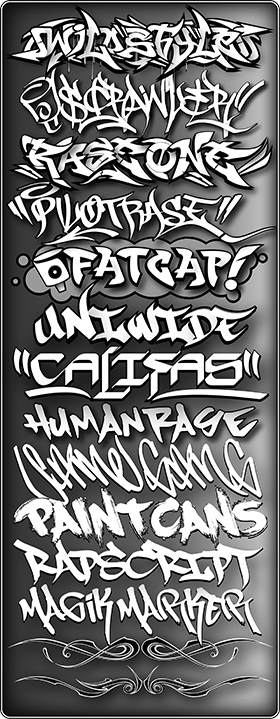 | Graffiti Fonts 3.0 The official Graffiti Fonts™ 3.0 collection. Now over 50 fonts in all, this collection features leading graffiti style fonts from around the world. Both free & commercial fonts are included in TrueType & OpenType formats for use on virtually any Mac, PC, or Linux computer. The Graffiti Fonts™ collection covers wildstyles, tags, stamps, gangster styles, old skool styles, tribals and more. |